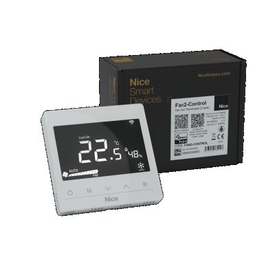Nice Fan-Control is an innovative Z-Wave thermostat designed for precise temperature control in buildings with 2-pipe fan coil units or 4-pipe fan coil units. It is ideal for use in offices or secondary homes, as it automatically adjusts fan speed based on temperature differences, programmed heating schedules, or manual inputs. Highlights: • Capacitive touch buttons for intuitive operation • Tempered glass panel and PC alloy housing for a modern design • Precise temperature setting function for optimal comfort • Non-volatile memory retains settings even during power outages • Intelligent on/off control for electric valves (ball valve) or air valves • Easy installation of the rear steel frame plate Technical Specifications: • Model: Fan2-Control • Wireless protocol: Z-Wave (Series 800) • Frequency: 868.4 MHz (EU) • Input voltage: AC85 – 260 V; 50/60 Hz • Rated current: ≤ 3 A • Load type: Resistive load • Power consumption: ≤ 1 W • Overcurrent protection: External 10 A circuit breaker required • Operating temperature: 0 to 55 °C • Temperature setting range: 5 to 37 °C • Temperature sensor: NTC 10K • Operating humidity: < 95% (non-condensing) • Mounting hole spacing: 60–65 mm (standard 60 or 86 mm wall box) • Dimensions: 86 x 86 x 14 mm Article Dimensions (WxHxL) 85 x 85 x 42 mm IP-Rating IP20